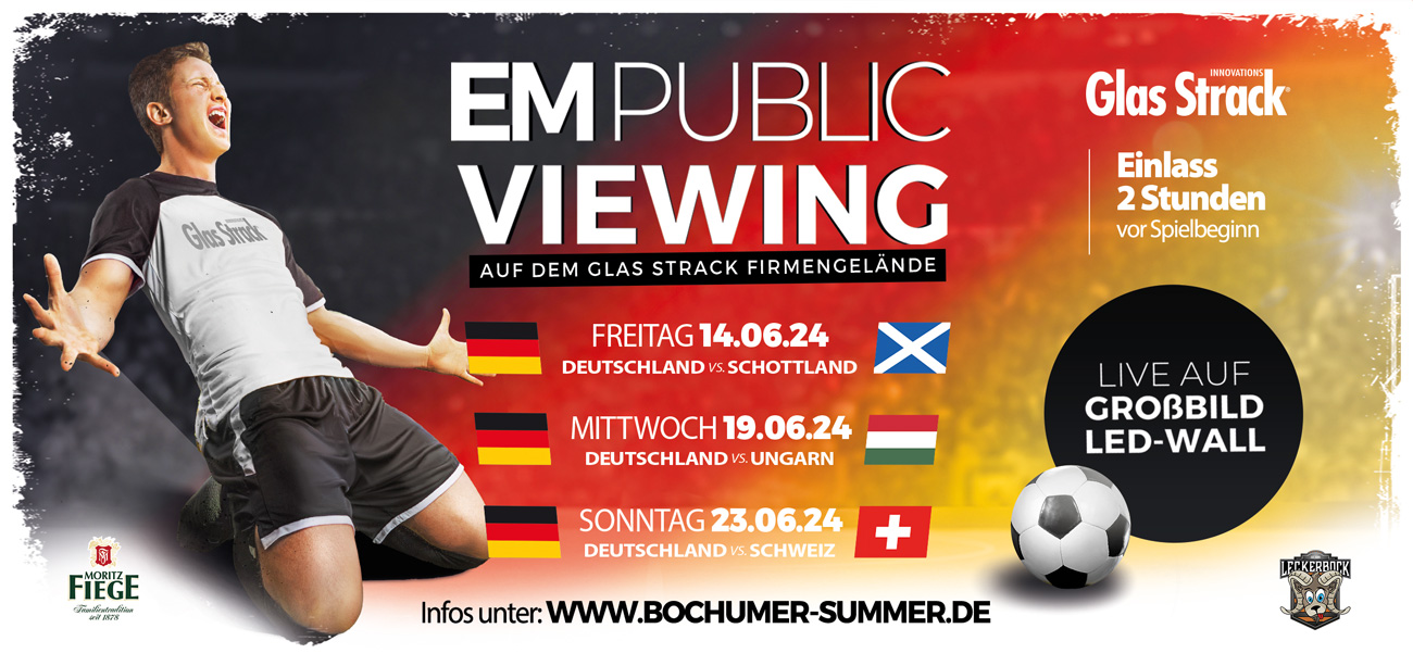 1 Tag Schlager Open-Air, 1 Tag Mallorca-Party und 3 Tage EM Public Viewing bei Glas Strack – mit unserem buntem Rahmenprogramm bieten wir euch beim Bochumer Summer Open-Air eine herausragende Möglichkeit mal wieder ausgelassen zu feiern.